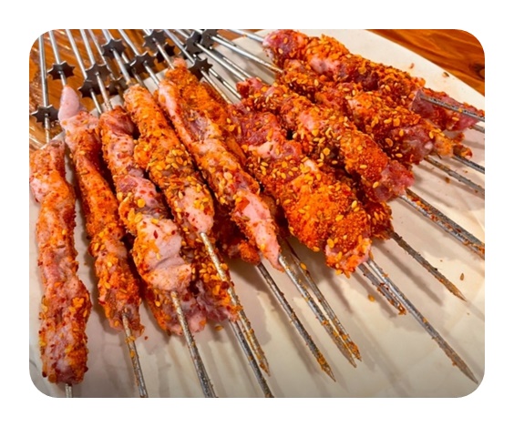 메뉴 : 양꼬치 14,000원 갈비살꼬치 16,000원 왕새우꼬치 14,000원 통갈비 56,000원 고급양갈비 32,000원