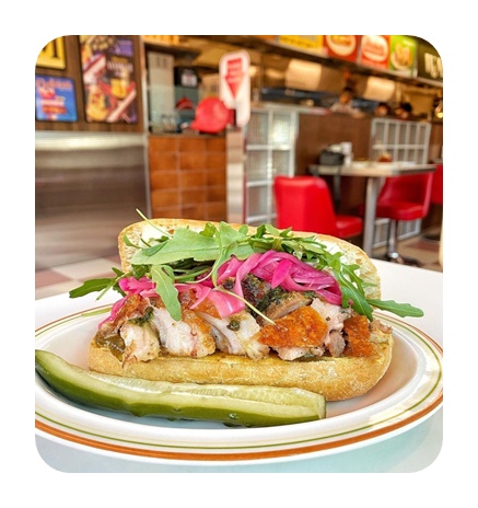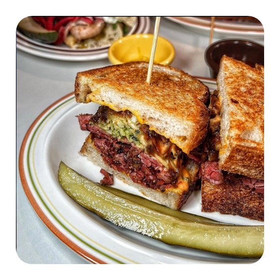 메뉴 : PASTRAMI QUEENS 14,800원 THE PORCHETTA 12,800원 DELI PASTRAMI 9,800원 NASHVILLE HOT SHRIP 12,800원 CLAM CHOWDER SOUP 7,300원 POTATO LATKE 6,1000원 COLESLAW 3,300