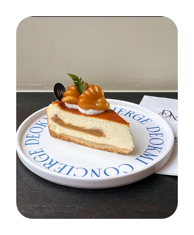 메뉴 : 약과치즈케이크 7,500원 딸기 티라미수 9,000원 로얄 바닐라라떼 6,500원 참외 그라니타 7,500원 무화과 피스타치오 다쿠아즈 7,500원 배와 쌀 그라니타 7,500원 초당 옥수수 치즈케이크 7,800원 화이트피치 티라미수 9,500원 그라니타 7,000원